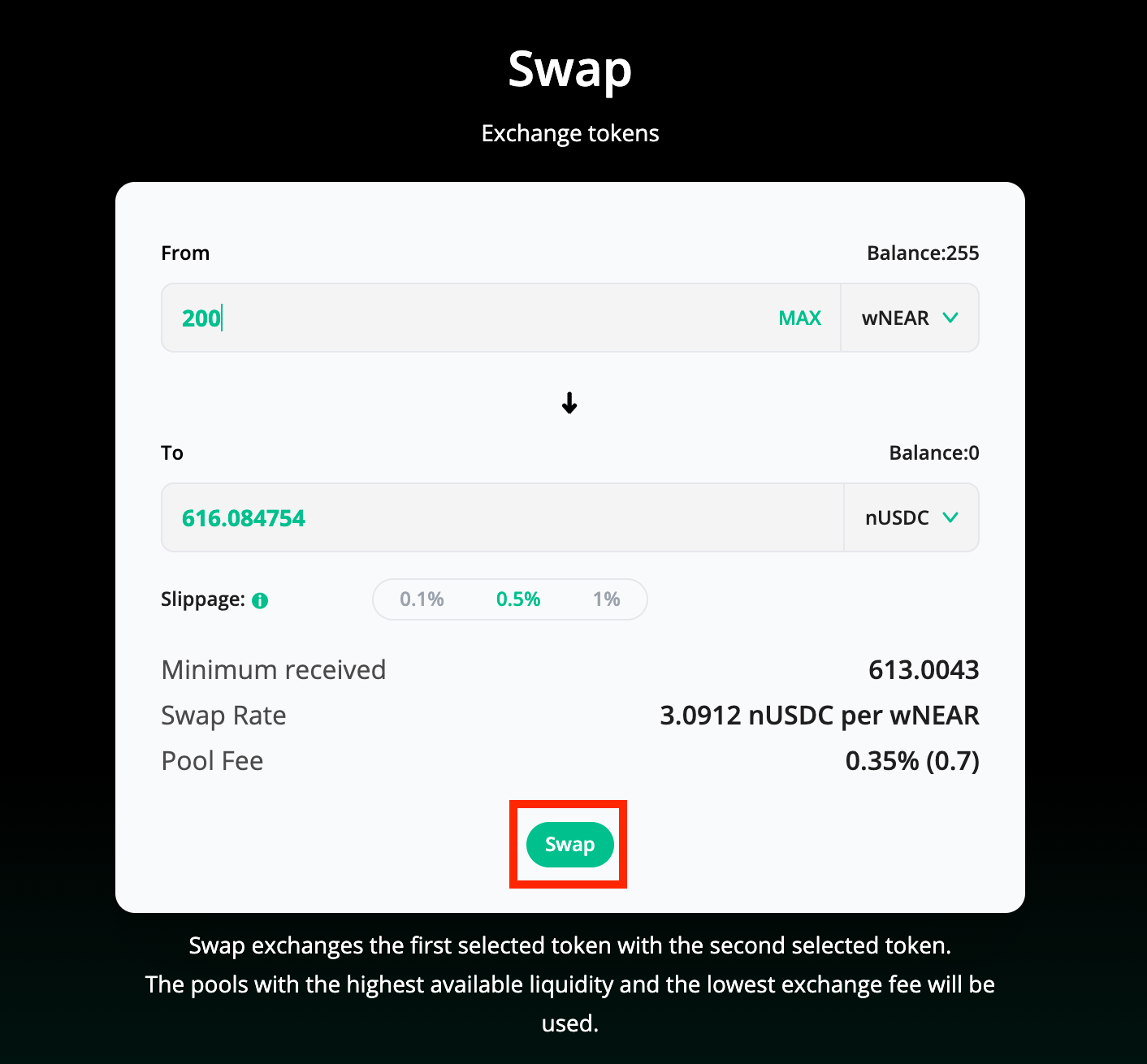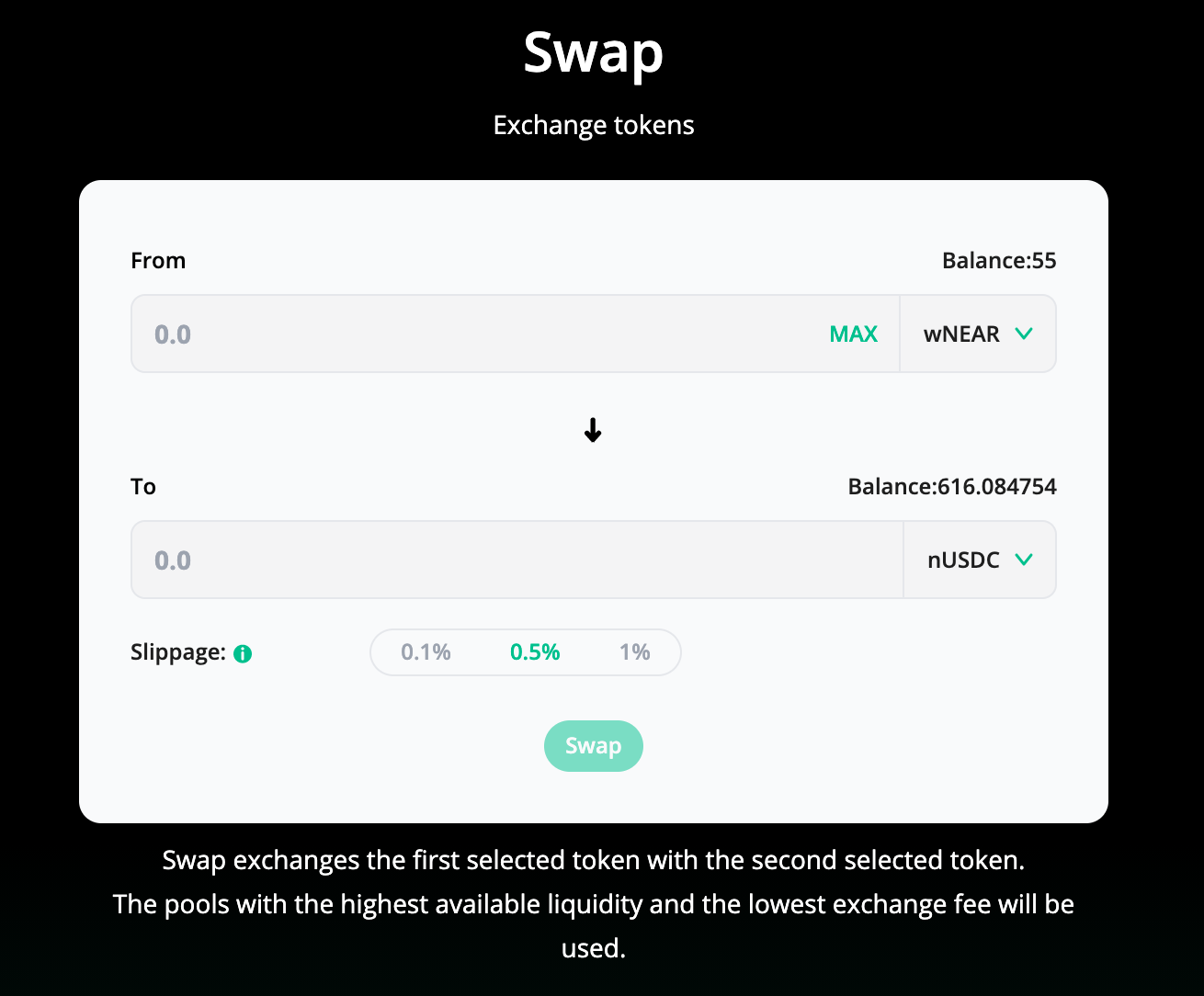 今回はwNEARとnUSDCをスワップするため、「From」にwNEARを、「To」にnUSDCを選択します。